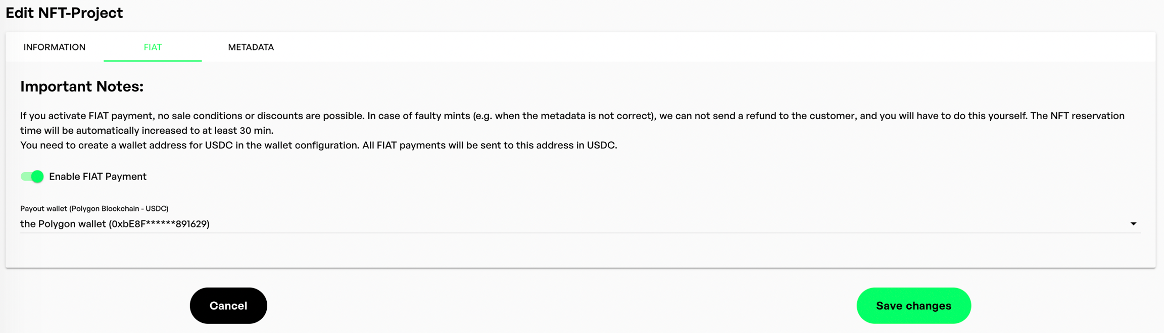 NMKR Pay allows you to offer your customers FIAT payment. The FIAT tab in the project settings is where you want to enable or disable it for your project and where you want to change the USDC payout wallet.