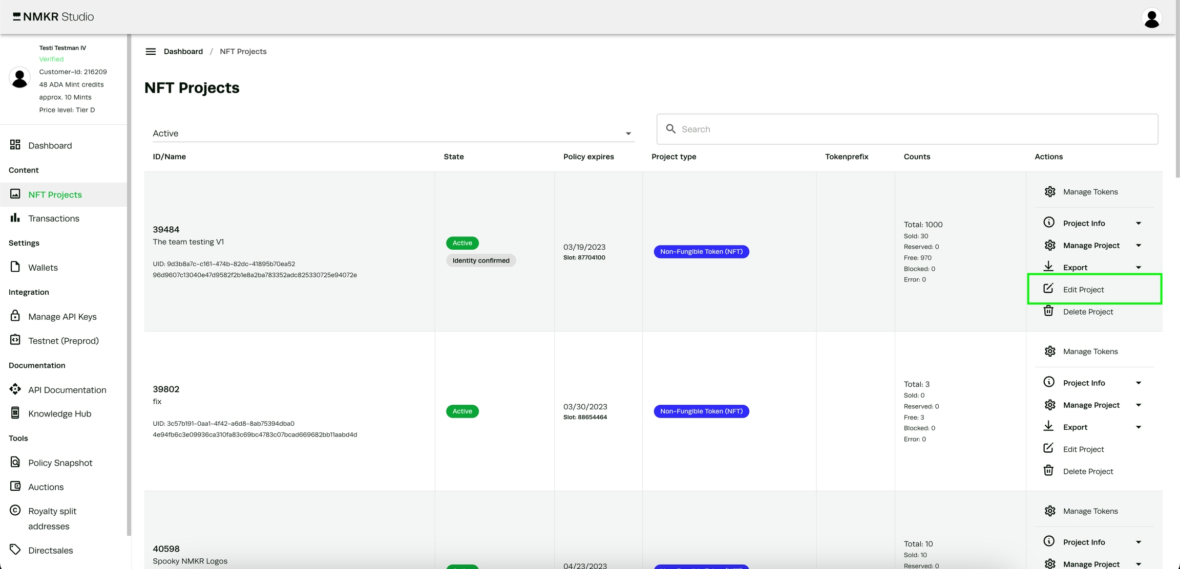 To make changes to your project settings, navigate to the NFT projects tab and click the edit button.