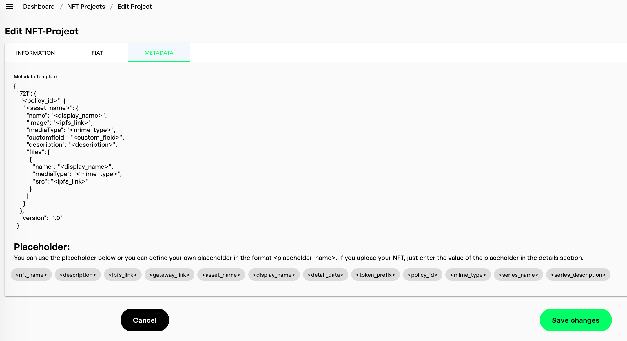 \<placeholders> are as the name already said, are meant to hold the place for values that will be given by each unique NFT. It is recommended to use the already specified placeholders in the standard metadata template, but you can [specify your own fields and placeholder](https://docs.nmkr.io/nmkr-studio/project/metadata-template#undefined)s too.