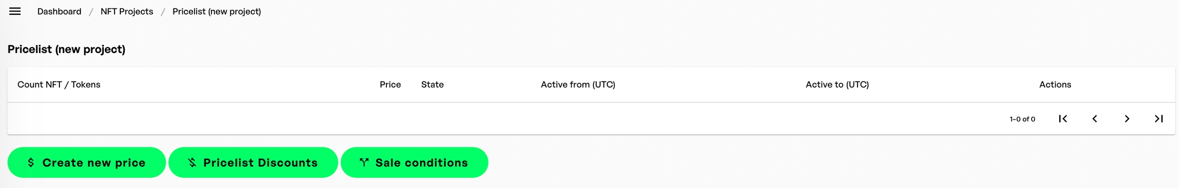 The prices are specified for every project separately, which allows you to also set up different sales for projects that share the same policy ID. The button can be found in the actions bar of every project in the NFT projects tab.