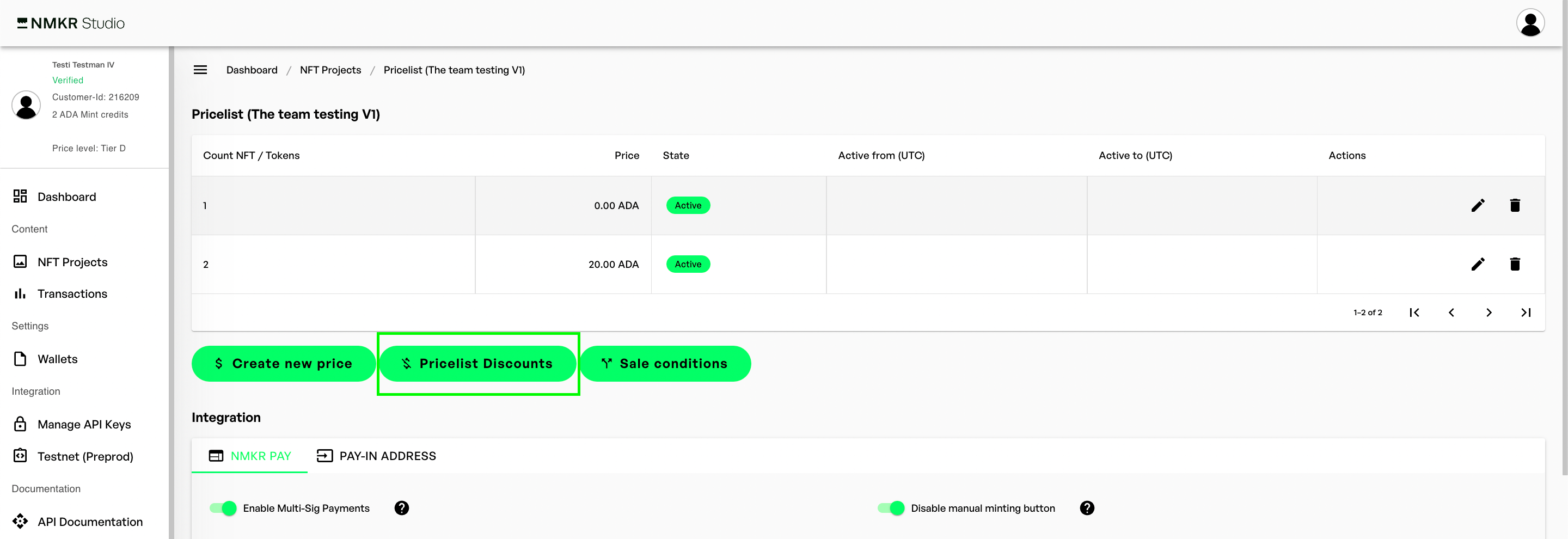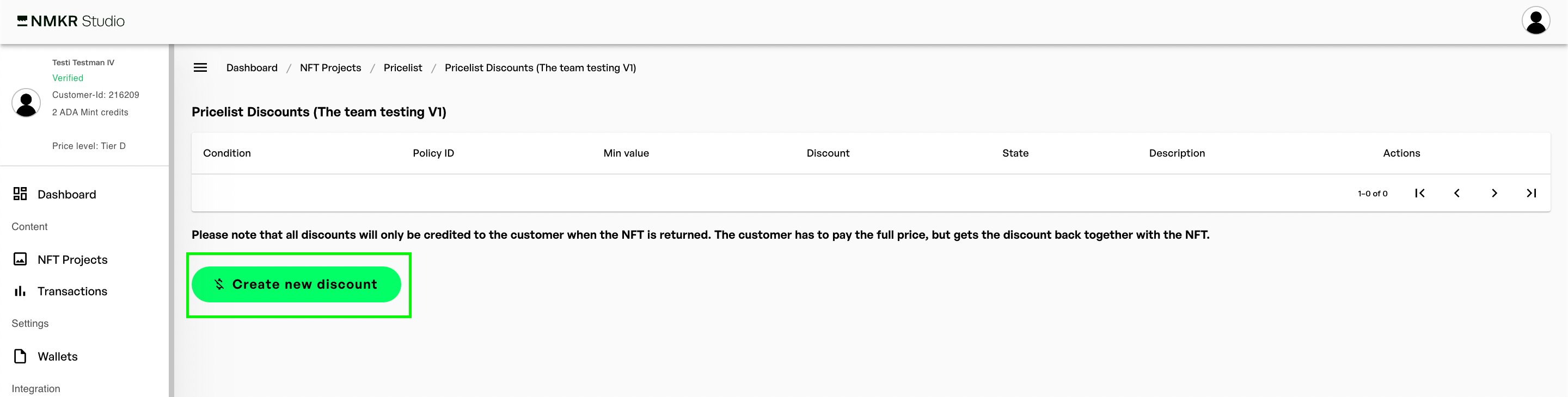 Go to your [price list](https://docs.nmkr.io/nmkr-studio/set-up-sales/manage-prices-pricelist) and click the "Pricselist Discounts" button.