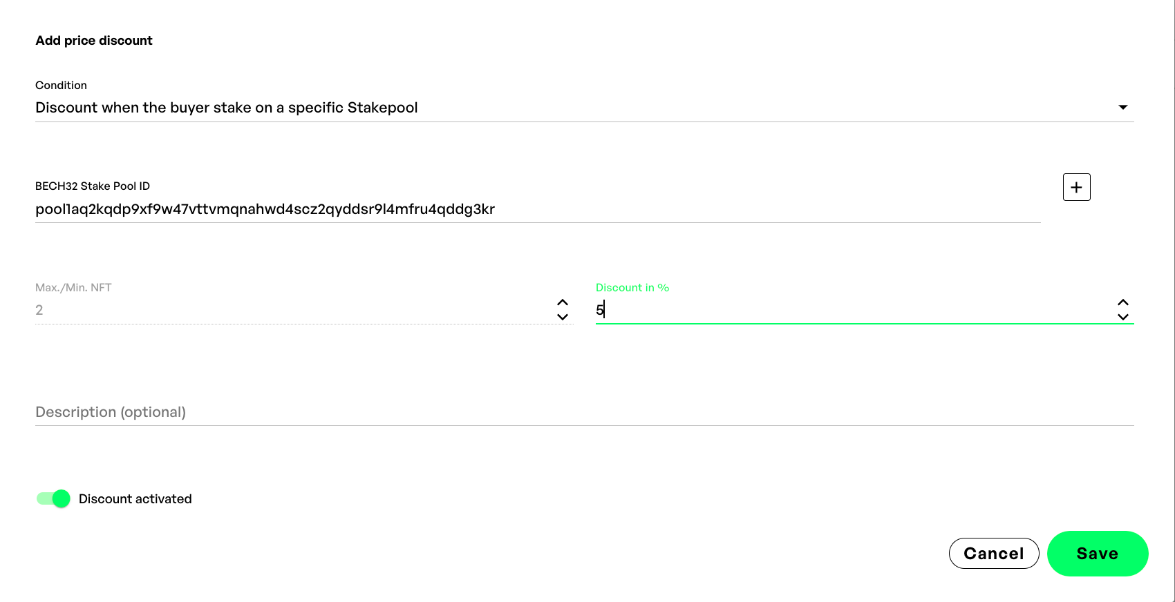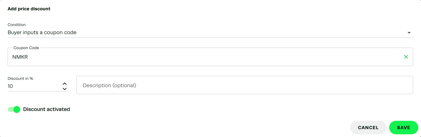 Check if the entries count is correct, add the discount in % and activate the price. Confirm by clicking on "save".
