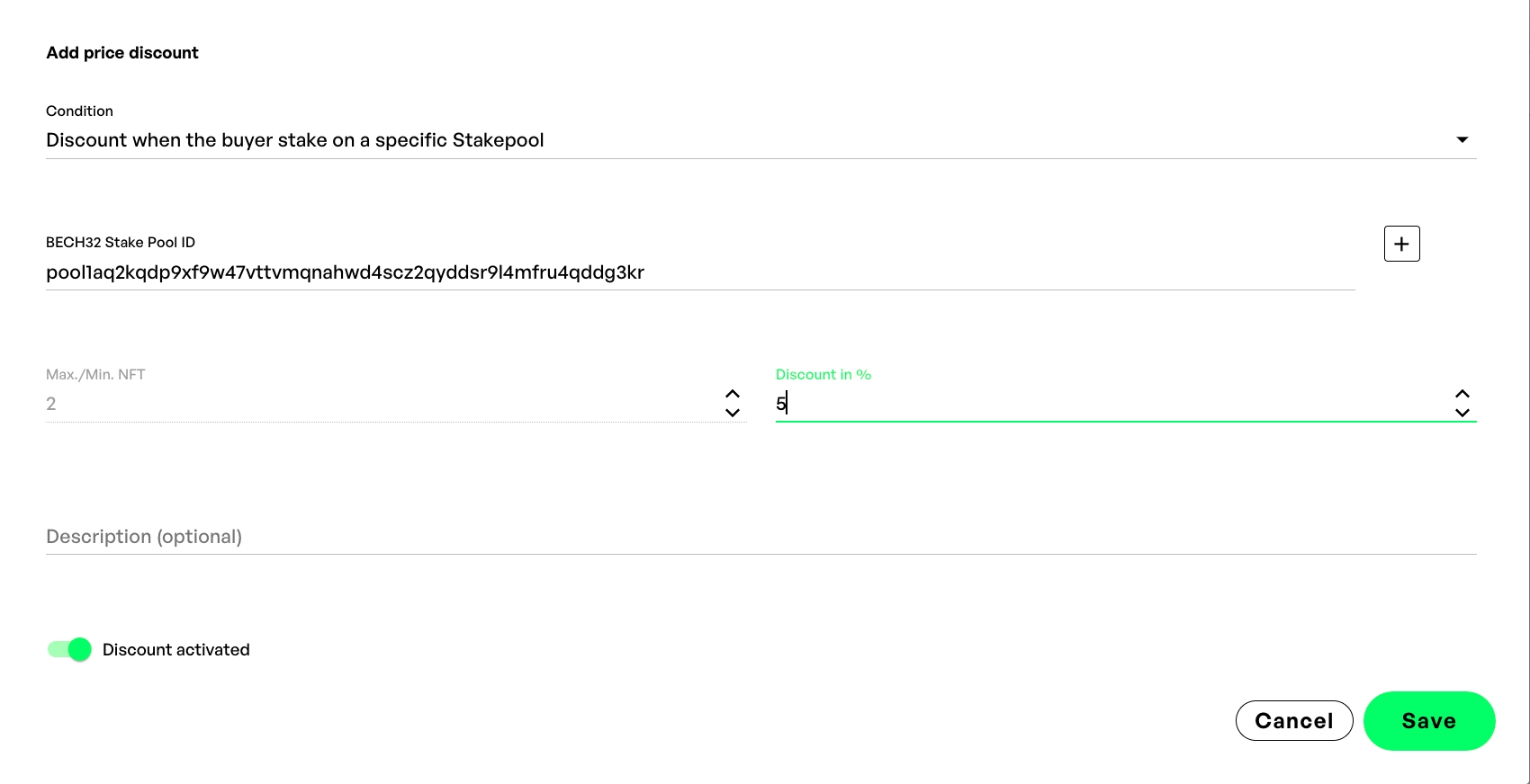 This discount feature will grant discounts to a delegator to a specific stake pool. Add the discount in % and activate the price. Confirm by clicking on "save". If you add multiple pool IDs by clicking on the "+", it will use an or-logic and means, the buyer must delegate either to pool A or pool B.