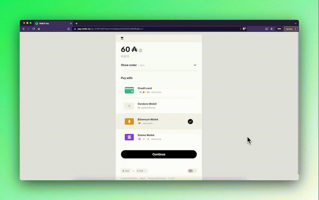 The FIAT currency as well as ETH and SOL will be instantly converted into ADA and you as seller also receive the ADA directly to your [payout wallet](https://docs.nmkr.io/nmkr-studio/project/edit#edit-fundamental-settings-of-your-project).