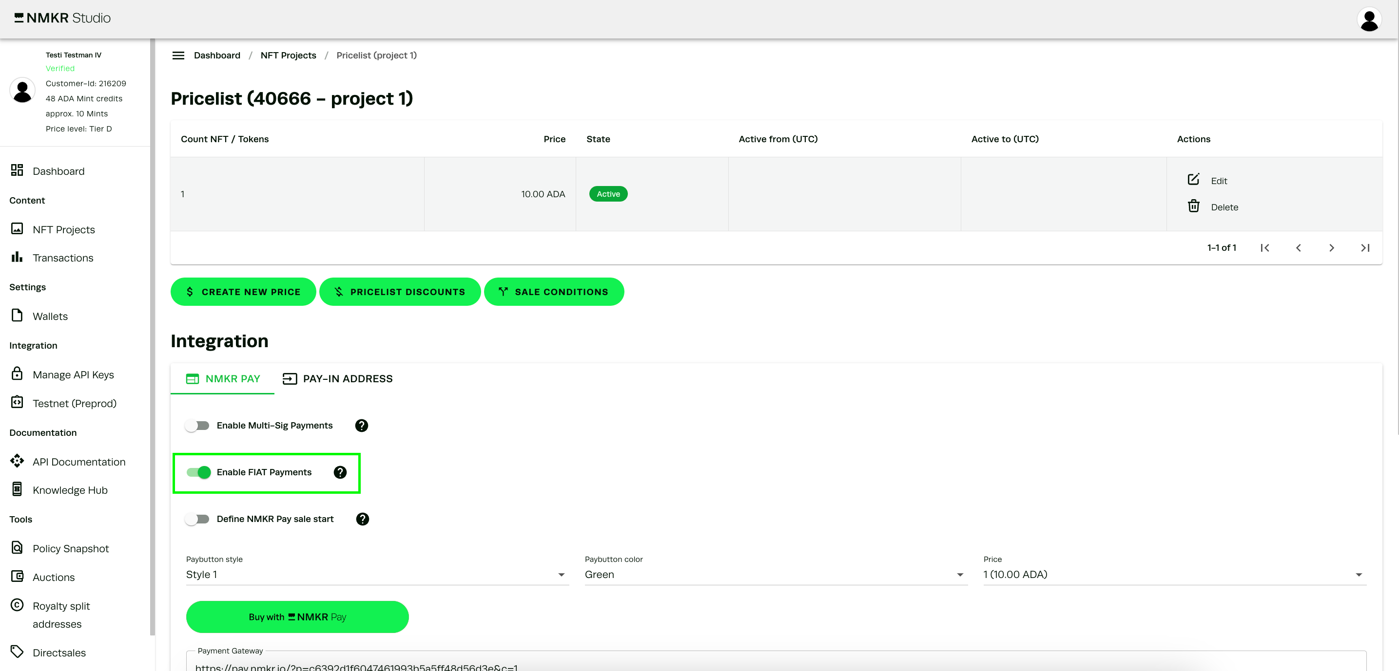 FIAT, ETH and SOL Payment is by standard enabled. FIAT Payment only for projects with prices over 5$ and is disabled in NMKR Pay for sales with [sales conditions](https://docs.nmkr.io/nmkr-studio/set-up-sales/sales-conditions-and-whitelisting).