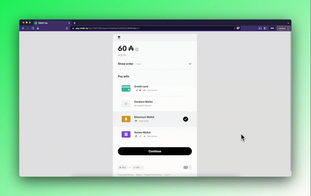 Allow your customers to pay with FIAT currency by using a Credit Card or ETH and SOL by connecting their wallet