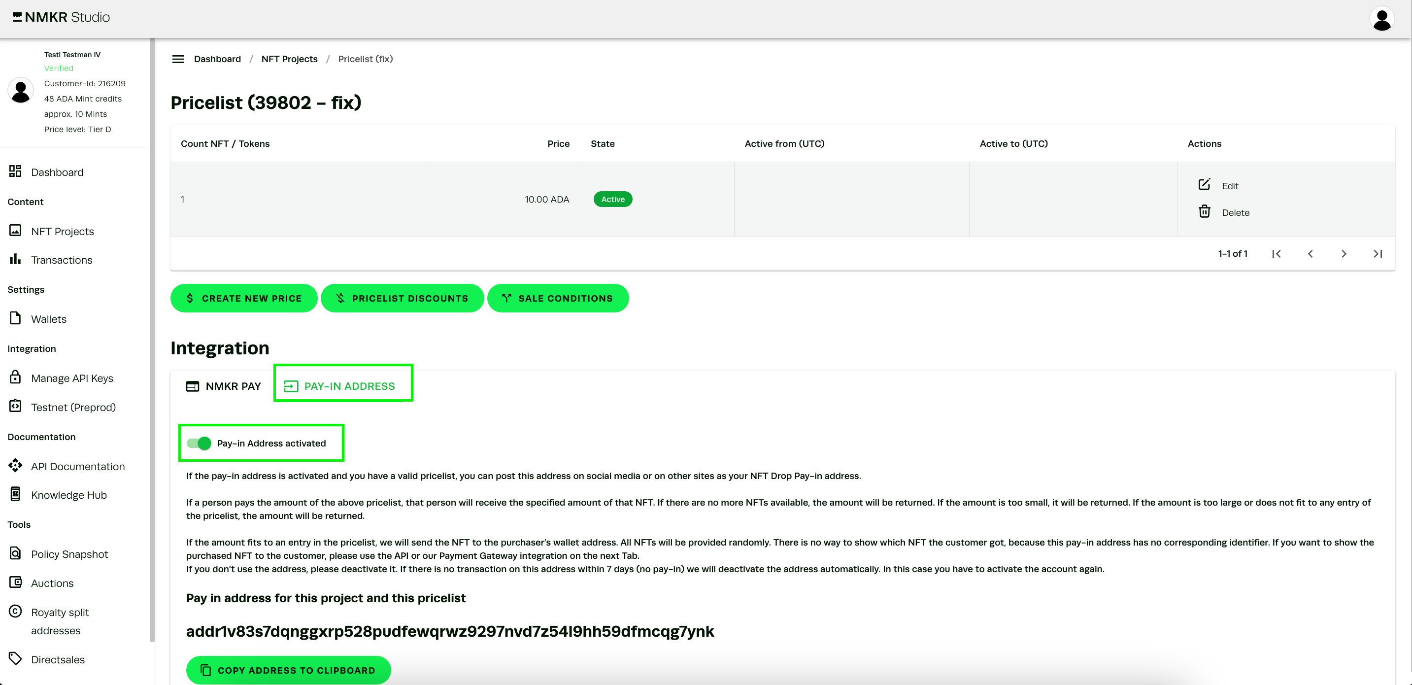 To activate the Pay-In address, please go to the[ price-list settings](https://docs.nmkr.io/nmkr-studio/set-up-sales/manage-prices-pricelist) and specify your prices there. After that, please scroll down.\