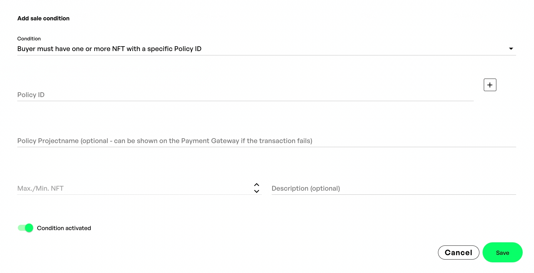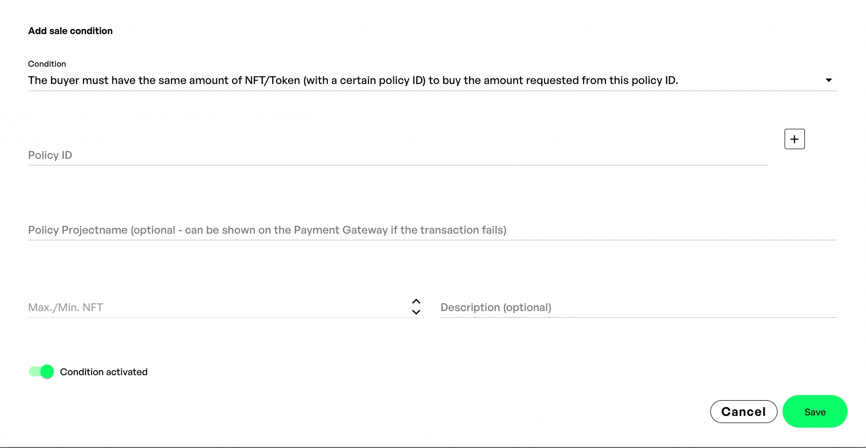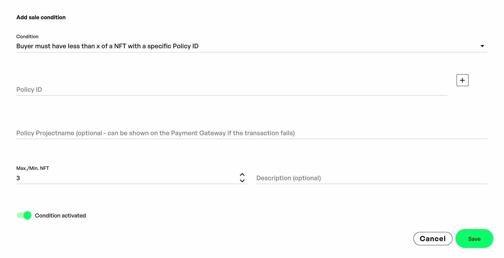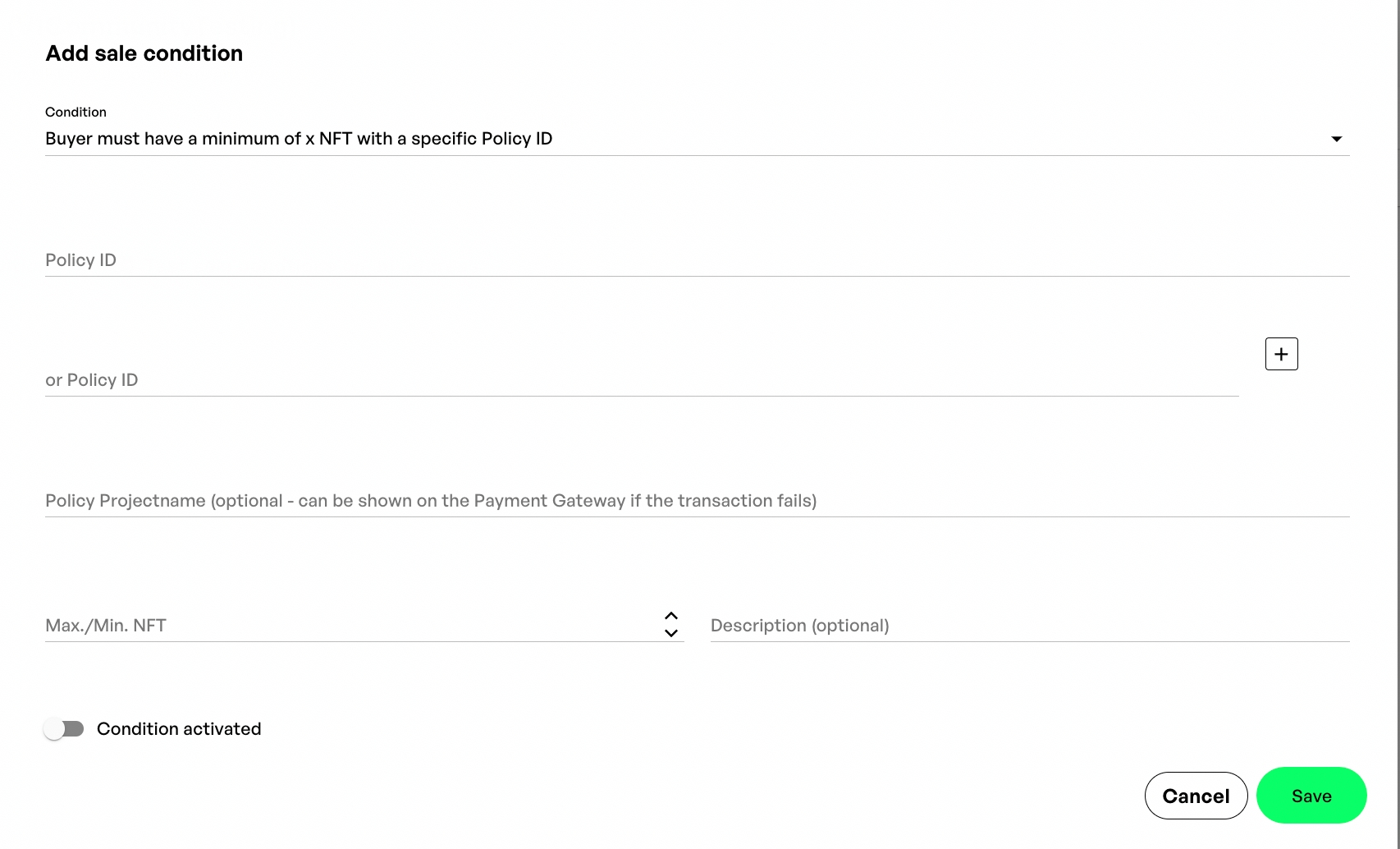 Allow holders of a token with a specific policy ID or* of specific policy IDs(+button) to mint a specified amount of tokens. This sales conditions requires adding a maximum Amount of Tokens that the buyer can buy. It can be used to limit the amount a buyer could buy from your current project if you use it with the policy ID of your project. *if you want to allow only holders of multiple policy IDs to mint, please just add multiple sales conditions, the "+button" here uses an or-logic.
