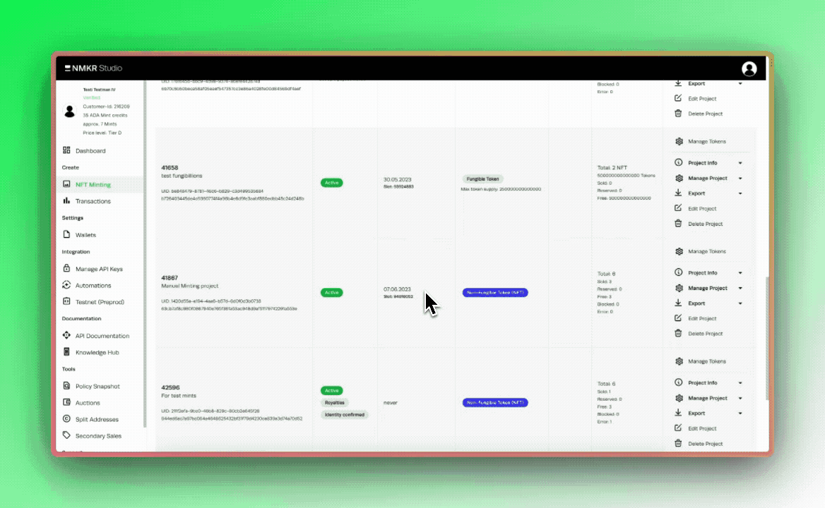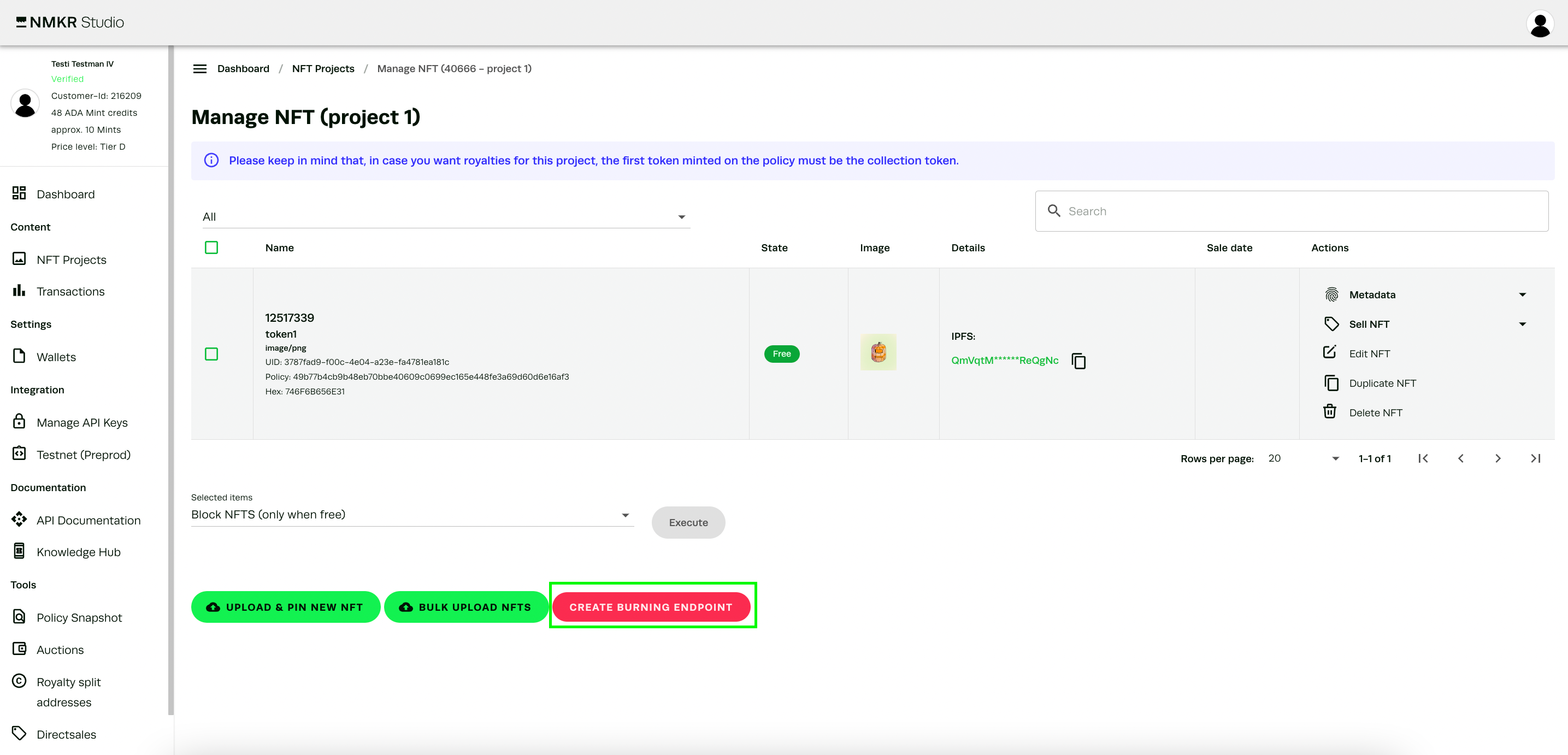 ### Burning in NMKR Studio