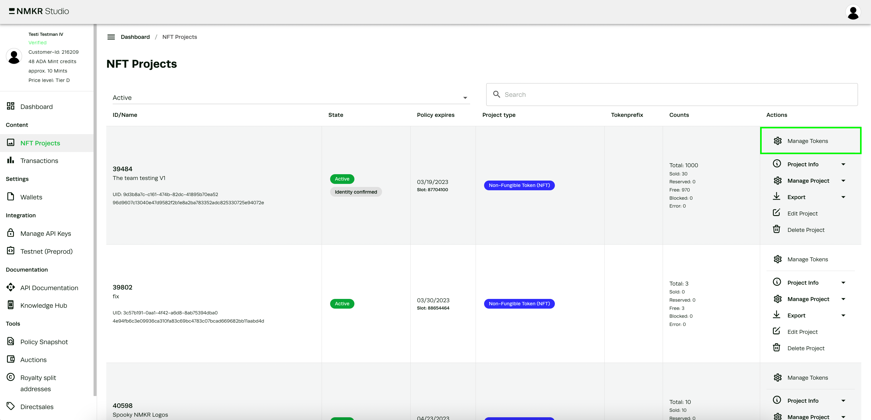<figure><img src="https://content.gitbook.com/content/bv1NlCoA0UqqILhTF1t0/blobs/OmU5W489hWs6dqtFqpt0/Screenshot%202023-02-09%20at%2010.30.23.png" alt=""><figcaption><p>Manage Tokens of your projects in this tab</p></figcaption></figure>