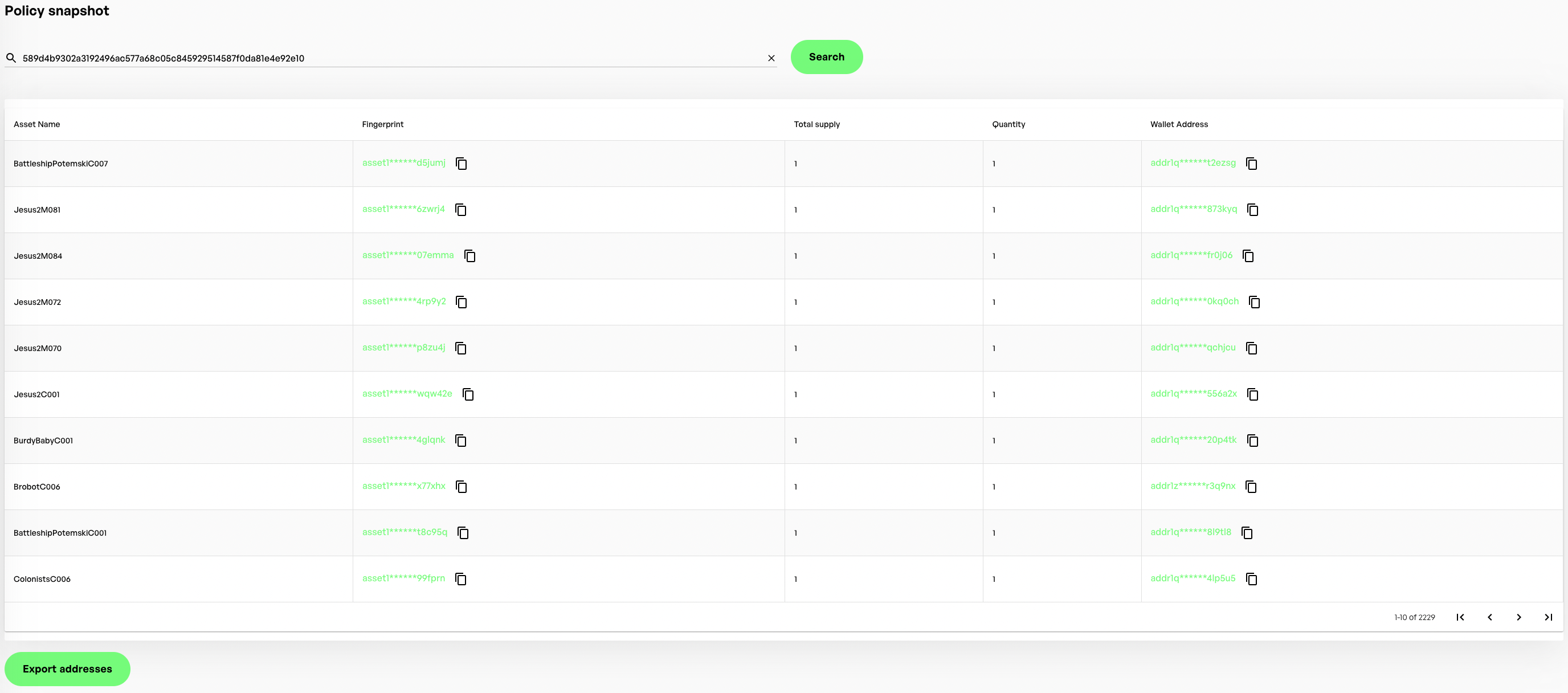 The primary application of a policy snapshot is to identify the holders of a specific policy and then use that information to airdrop tokens to the holders or to create a whitelist. You can use the policy snapshot tool with any Cardano policy ID.
