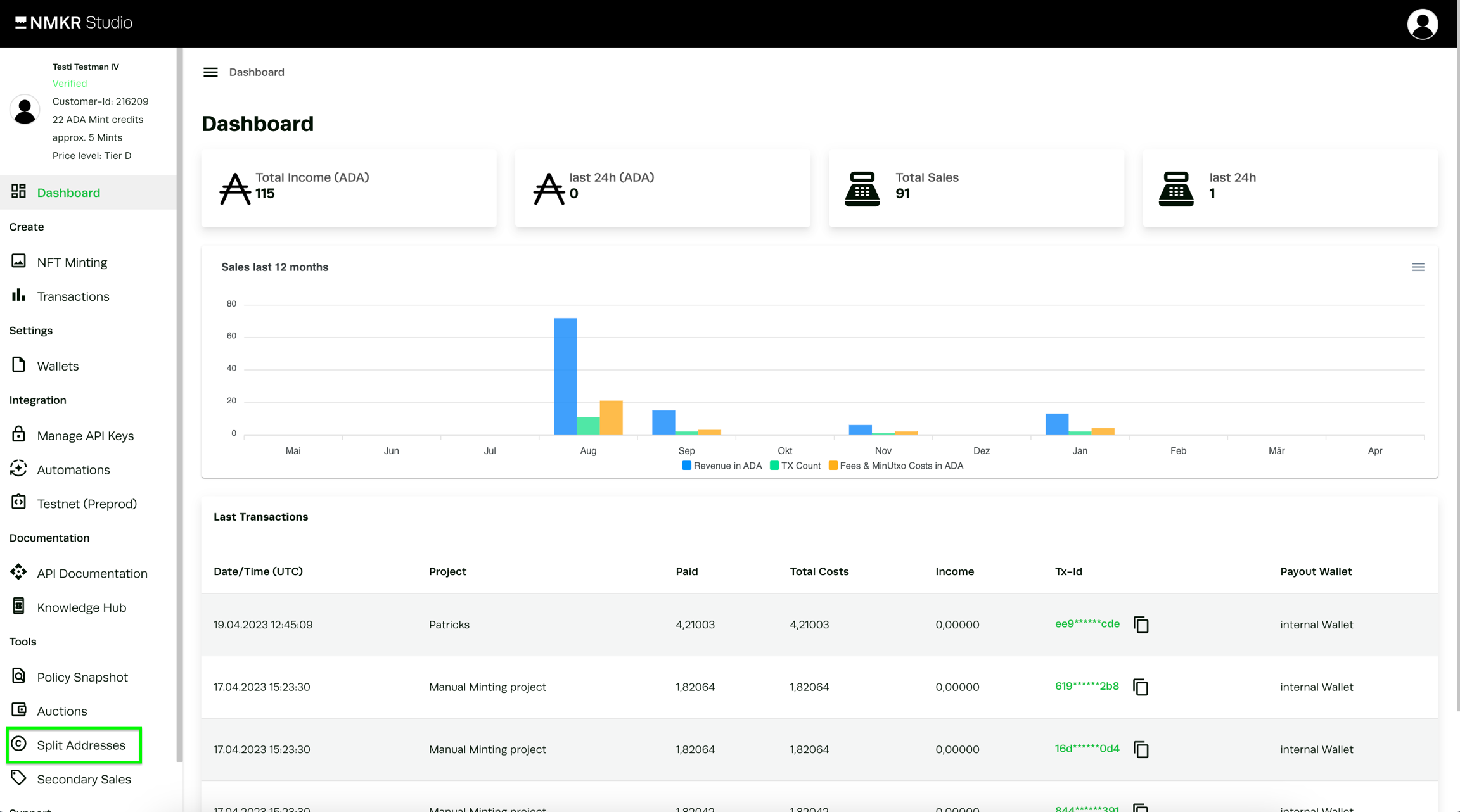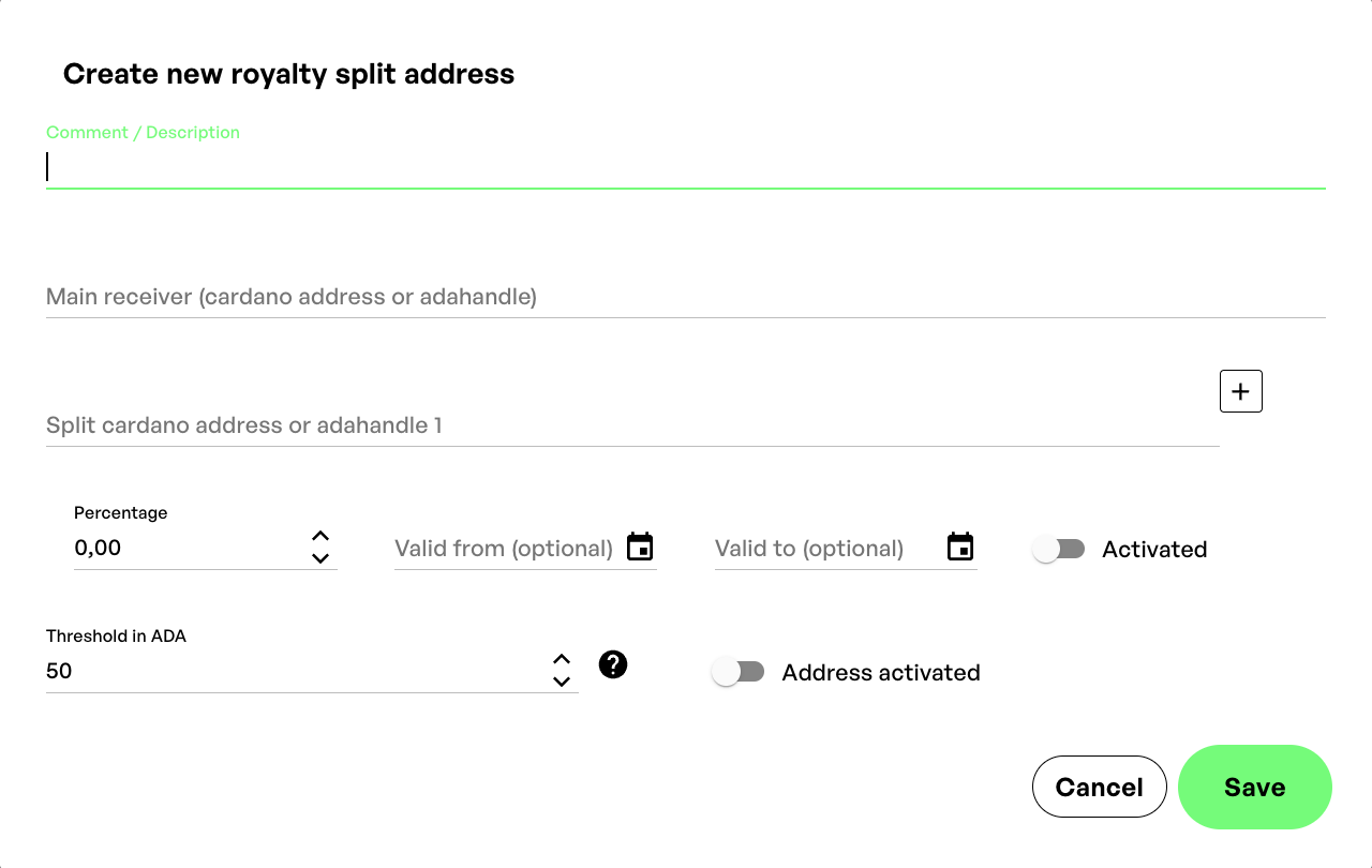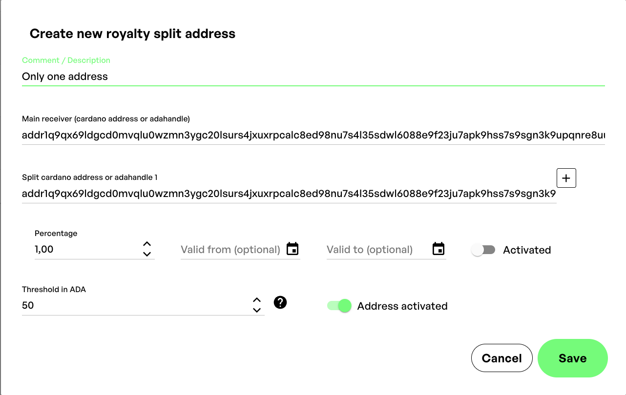 Cardano uses the CIP-0027 standard for Royalties, which allows only one address to be used as the receiver address and it also cannot be changed later. With the Split Address, you can now specify an address that receives royalties and distributes them in different percentages to multiple receiver wallets. It also has the significant advantage of allowing you to change the receiving addresses at any time. You can also use an adahandle as the receiver address, which is useful if the project owner changes.