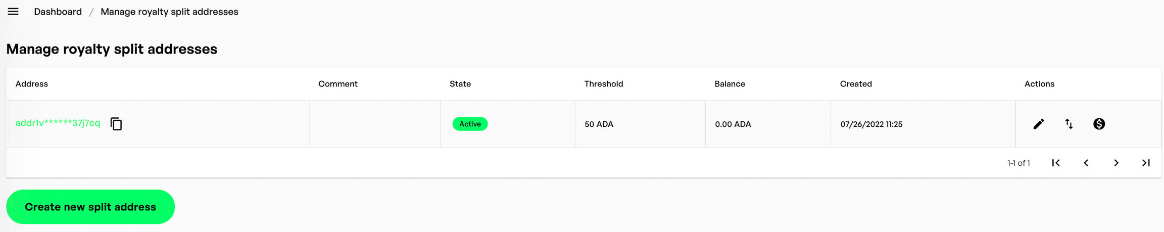 By clicking on the edit button in the actions bar, you can change all details of the royalty split address except its own address, such as receiving addresses, percentages, and so on. You can change the information at any time.